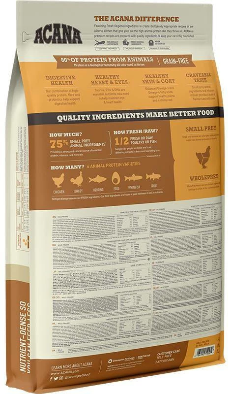 I gatti necessitano di una dieta ricca di proteine animali. Questa necessità è determinata dalla loro costituzione fisiologica e dalla loro natura carnivora. Ispirato alle vaste praterie canadesi e ai laghi incontaminati, ACANA Wild Prairie offre al vostro gatto ingredienti animali di alta qualità, come pollo e tacchino allevati all’aperto, pesce d’acqua dolce e uova allevate in fattoria. Di conseguenza, ACANA è ricca di proteine e nutrienti provenienti dalla carne dei muscoli, dagli organi interni, dalla cartilagine e dalle ossa presenti nelle proporzioni WholePrey dei nostri alimenti. In questo modo si assicura che il gatto riceva tutto ciò di cui ha bisogno per raggiungere la piena salute.