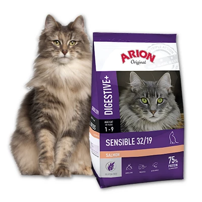 Arion Original Sensible per gatti sensibili è arricchito con i probiotici MOS e FOS per bilanciare la flora batterica intestinale e garantire la corretta consistenza delle feci.