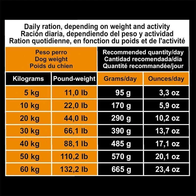 La quantità di cibo può variare in base all’attività, alla razza del cane e alle condizioni ambientali.