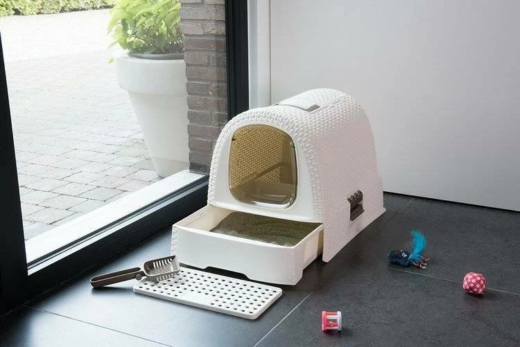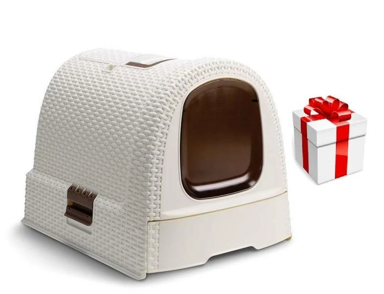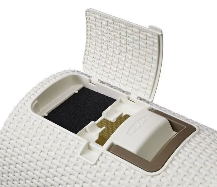 Curver ha creato la toilette perfetta, che non è solo esteticamente piacevole ma soprattutto molto pratica. È fatto di materiale simile al rattan. La lettiera ha un cassetto estraibile e uno scomparto per gli accessori (paletta e tappetino per pulire le zampe inclusi). È dotato di chiusure strette che limitano la fuoriuscita della lettiera e di un filtro anti-odore che aumenta il comfort del suo utilizzo, mentre una comoda maniglia lo rende facile da trasportare.