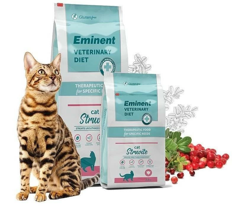 La scelta del cibo giusto è una parte molto importante del trattamento dei pazienti felini con calcoli di struvite. L’alimentazione corretta aiuta a riportare il pH dell’urina nell’intervallo ottimale e contribuisce alla dissoluzione dei calcoli di struvite esistenti. Grazie alla riduzione dei livelli di minerali, la possibilità di formazione di nuovi cristalli è ridotta al minimo. Queste esigenze particolari sono soddisfatte dall’alimento completo Eminent Veterinary Diet Cat Struvite. Uno degli ingredienti funzionali di questo alimento è il mirtillo rosso, che contiene proantocianidine. Queste sostanze hanno la capacità di ridurre l’adesione batterica alle pareti della vescica e la formazione di colonie, contribuendo così a prevenire le infezioni batteriche dell’intero sistema escretore.