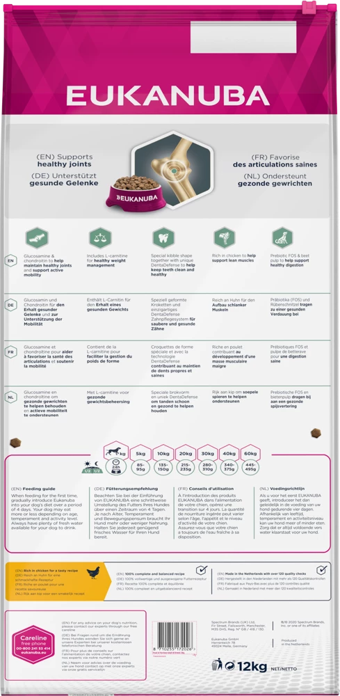 La gioia di vivere e di muoversi in modo efficiente: per il tuo cane adulto, ogni giorno è un’avventura, che tenta con divertimento e nuove esperienze. Eukanuba Daily Care Adult Sensitive Joint è progettato per sostenere la mobilità dei cani adulti di tutte le razze e fornisce al tuo animale domestico ingredienti equilibrati e sani. Il cibo è stato preparato con gustoso pollo come fonte di proteine di alta qualità. Questi possono contribuire al mantenimento della massa muscolare. Eukanuba Daily Care Adult Sensitive Joints contiene fibre e prebiotici per sostenere la digestione. Contiene prebiotici e polpa di barbabietola, supporta la digestione. Fonte di glucosamina e condroitina, componenti naturali della cartilagine. Contiene L-carnitina.