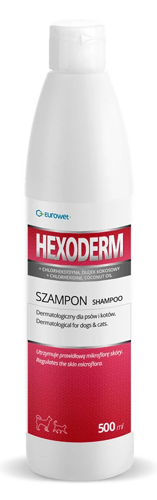Shampoo dermatologico per cani e gatti. Hexoderm è un dermocosmetico veterinario che regola la microflora della pelle, stabilizza il suo pH e previene la secchezza lasciando un sottile strato grasso-proteico. I delicati agenti di lavaggio contenuti nel liquido ne permettono un uso frequente.