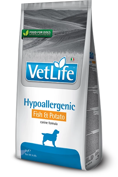 Farmina Vet Life Hypoallergenic Fish & Potato è un alimento dietetico completo per cani adulti per ridurre l’intolleranza agli ingredienti e ai nutrienti, sostenere la funzione della pelle in caso di dermatiti e perdita di pelo.