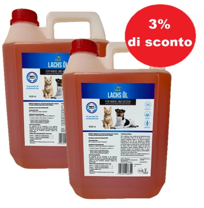 Olio di salmone puro e naturale al 100% proveniente dall’Oceano Atlantico. Una straordinaria ed eccellente fonte di vitamine A, E, D3 e di acidi grassi polinsaturi della famiglia omega-3 e omega-6, in particolare EPA e DHA. Utilizzato come supplemento alla dieta quotidiana, ha un effetto molto positivo sulle condizioni della pelle e del mantello dell’animale, si prende cura del suo cuore, sostiene il lavoro delle sue articolazioni, rafforza l’immunità, regola il lavoro del sistema nervoso e riduce le reazioni allergiche.