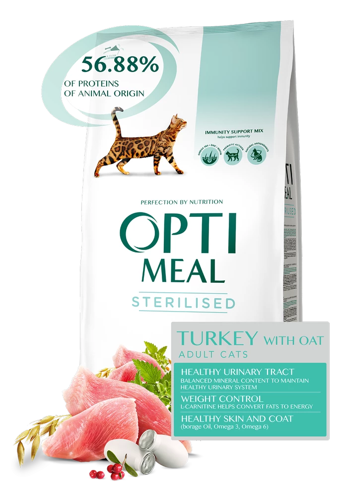 Optimeal per gatti sterilizzati e femmine con tacchino e avena – alimento super premium per gatti sterilizzati e femmine, prodotto sotto controllo veterinario. La ricetta unica per la salute e la bellezza del vostro animale contiene ingredienti di carne selezionati, erbe utili, bacche, antiossidanti naturali e prebiotici.