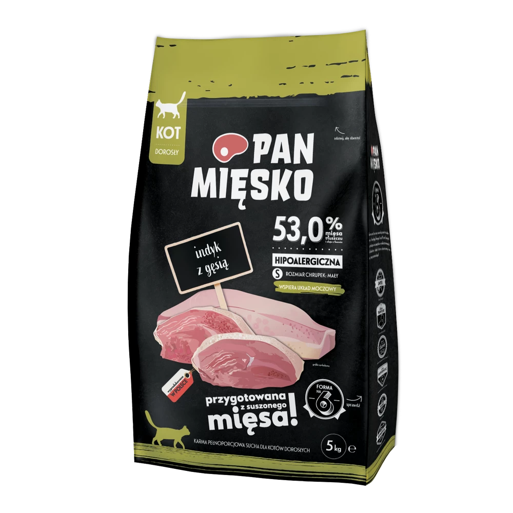 Ecco il cibo secco ipoallergenico per gatti Pan Mięsko. Si distinguono per le carni accuratamente selezionate con succose mele polacche, verdure sane e preziosi nutrienti che influenzeranno positivamente la salute e le condizioni del vostro gatto. Le nostre ricette sono state preparate da specialisti per fornire al vostro compagno a quattro zampe esattamente ciò di cui ha bisogno. Il vostro gatto merita il meglio.