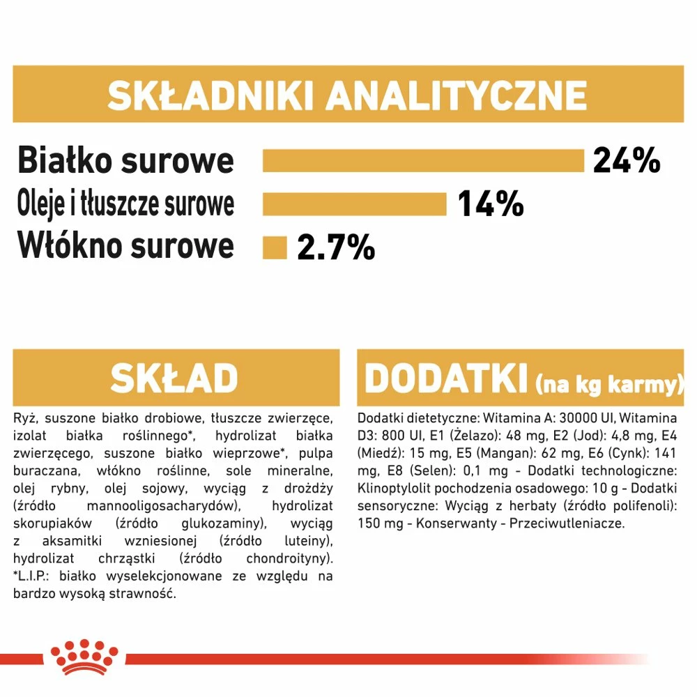 Salute e protezione delle articolazioni Royal Canin Bulldo sostiene il mantenimento della massa muscolare degli adulti e, grazie a un ottimo contenuto proteico (24%), un alto contenuto di L-carnitina, condroitina e glucosamina, nonché acidi grassi omega-3 (EPA/DHA), contribuisce alla formazione e alla protezione delle articolazioni.