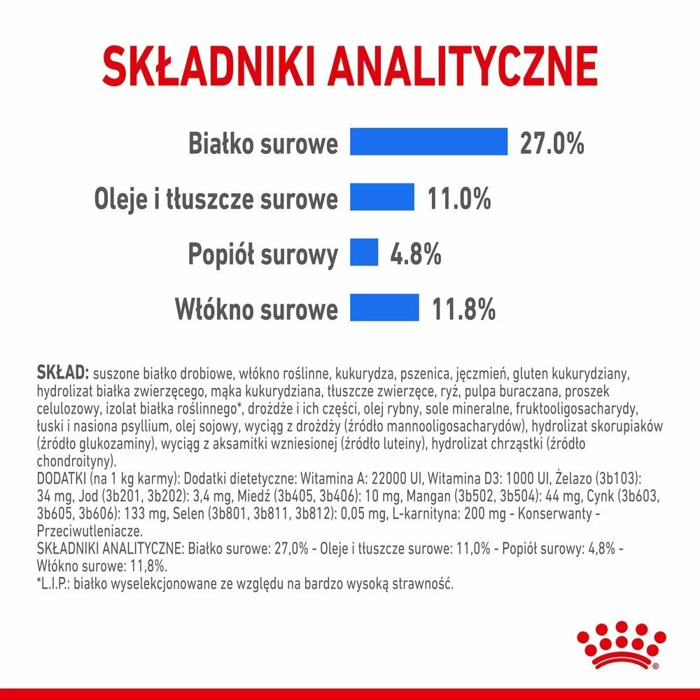 COMPOSIZIONE: proteine di pollame disidratate, fibre vegetali, mais, frumento, orzo, glutine di mais, idrolizzato proteico animale, farina di mais, grassi animali, riso, polpa di barbabietola, cellulosa in polvere, isolato proteico vegetale*, lievito e loro parti, olio di pesce, sali minerali, fruttoligosaccaridi, bucce e semi di psyllium, olio di soia, estratto di lievito (fonte di mannooligosaccaridi), idrolizzato di molluschi (fonte di glucosamina), estratto di tagete (fonte di luteina), idrolizzato di cartilagine (fonte di condroitina).