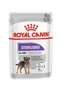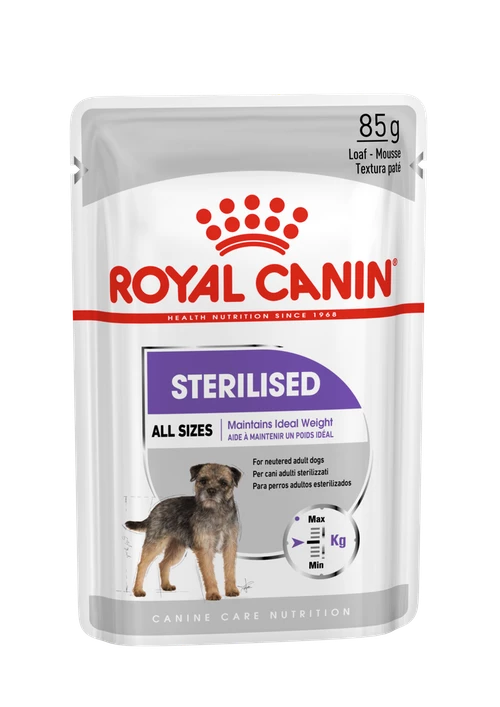 ROYAL CANIN Sterilised Mini in forma di patè è un alimento adatto a cani adulti sterilizzati di razze da 1 a 10 kg, oltre i 10 mesi di età, con tendenza al sovrappeso.