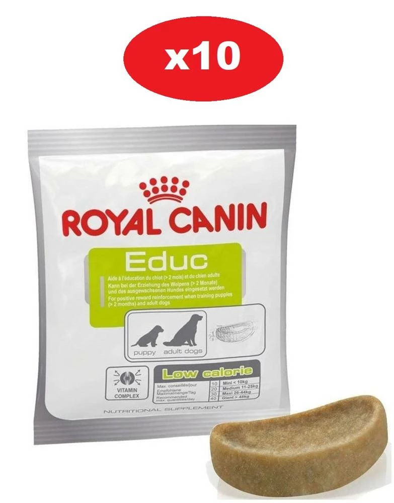 ROYAL CANIN Nutritional Supplement Educ 50g è adatto per l’addestramento o la ricompensa quotidiana per cani di età superiore ai due mesi. L’altissima digeribilità della proteina contenuta nel trattamento si traduce in un nutrimento supplementare per l’animale. I bocconcini salutari per cuccioli e cani adulti &ndash è disponibile in una forma conveniente – è facile da prendere tra le dita e il vostro cane lo mastica avidamente e accuratamente. Grazie alla sua consistenza morbida, il bocconcino può essere tagliato in pezzi più piccoli; sarà utile nell’addestramento delle razze in miniatura. Il basso contenuto di grassi previene il sovrappeso, soprattutto nei cani adulti.