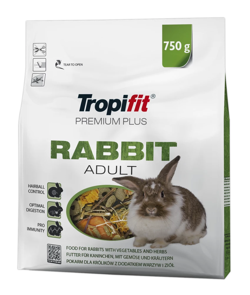 L'animale dovrebbe avere accesso costante a fieno e acqua. Se la dieta del coniglio è integrata con verdure fresche ed erbe aromatiche, la quantità di cibo somministrato può essere ridotta.TROPIFIT Premium Plus CONIGLIO ADULTO 750g – Per Un Coniglio