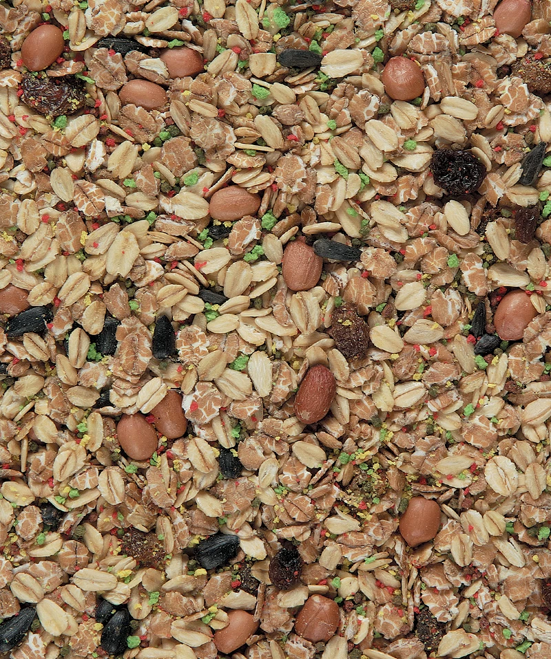 Farina d’avena (44,5%), fiocchi di frumento, strutto pulito (10%), semi di girasole, pangrattato, arachidi sgusciate, uva sultanina (4%), semi di lino, semi di canapa, olio vegetale