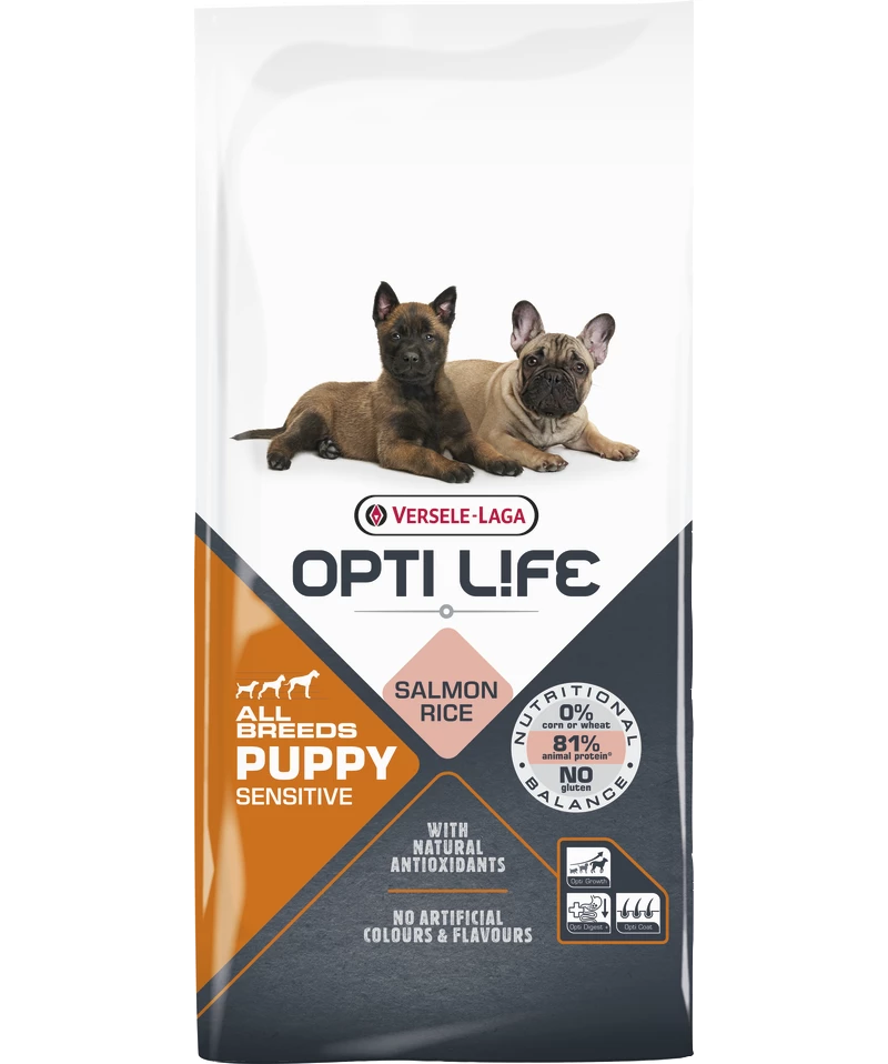 Alimento perfettamente bilanciato per cuccioli con un sistema digestivo sensibile di tutte le razze. Opti Life Puppy Sensitive All Breeds è un alimento perfettamente bilanciato a base di salmone e riso, sviluppato appositamente per i cuccioli con un sistema digestivo sensibile. È senza glutine, non contiene grano o mais, e quindi combatte le intolleranze e le allergie alimentari. L’80% delle proteine presenti nel cibo sono di origine animale, facile digestione e feci compatte. Ideale per cuccioli con un sistema digestivo sensibile (intolleranze alimentari), assicura una corretta microflora intestinale (FOS, MOS) La ricetta Opti Life Sensitive è arricchita con acidi grassi omega-3 e omega-6 da salmone e olio di salmone extra aggiunto. Questo mantiene il cappotto del vostro cane lucido. La nostra formula contiene anche biotina e l’aggiunta di zinco e rame facilmente digeribili per una pelle e un pelo sani.