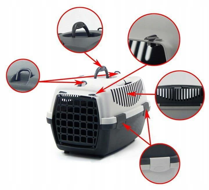 Per cani o gatti fino a 10 kg. Ha maniglie speciali che permettono di fissare il trasportino con le cinture di sicurezza dell’auto. Robusta maniglia per il trasporto del portapacchi. Sistema speciale di cerniere. La porta può essere aperta a destra o a sinistra in qualsiasi momento. Naturalmente ha anche un sistema di chiusura delle porte. Il trasportatore è dotato di numerosi fori di ventilazione per garantire il libero accesso dell’aria. Ha numerosi scompartimenti per i croccantini e un comodo supporto per la cintura di sicurezza dell’auto, così possiamo trasportare il nostro animale domestico in modo rapido e sicuro.